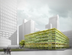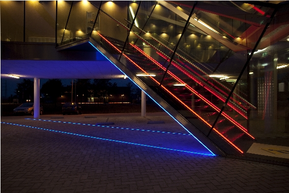 Tegen het bestaande gebouw van de KLPD in Assen zette architecten van Mourik een nieuw bouwdeel. De uitbreiding werd vervolgens opgetild, om op straatniveau voldoende parkeergelegenheid te bieden voor politieauto’s. Midden in de nieuwbouw maakten we een patio met een trap. Door de vervormde gevels in de patio lijkt de ruimte overdag een diamant, ’s avonds en ’s nachts worden de lijnen geaccentueerd door de lichtinstallatie van Tamar Frank.